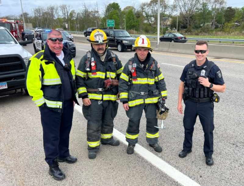 Off we went, traveling through pristine Rhode Island countryside with panoramic ocean views. Exciting as the trip started, we came to find out, it was only the beginning. At about the 12-mile mark, a passer-by mistook steam for smoke and called 911! We were quickly surrounded by a police officer, EMTs and fire department personnel; after a good-natured group photo, we were back on our way!